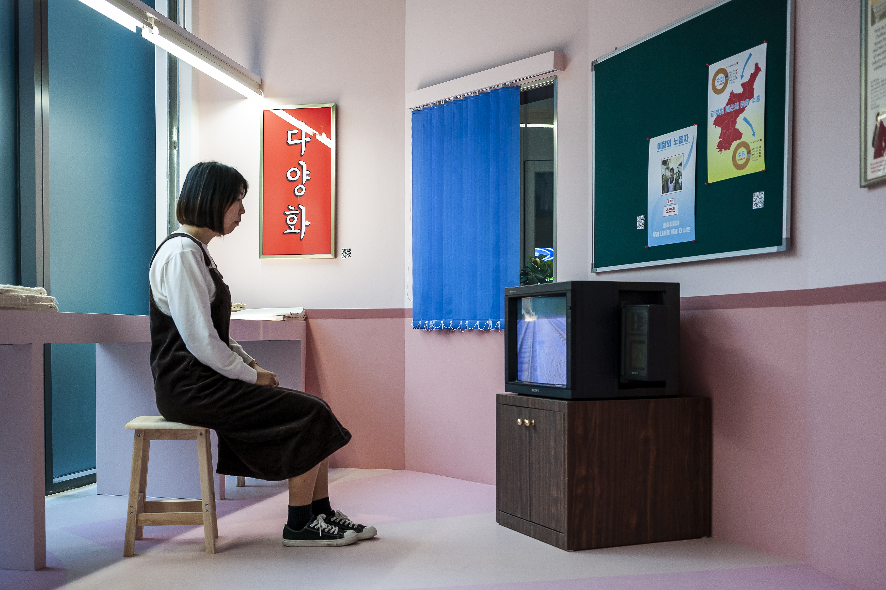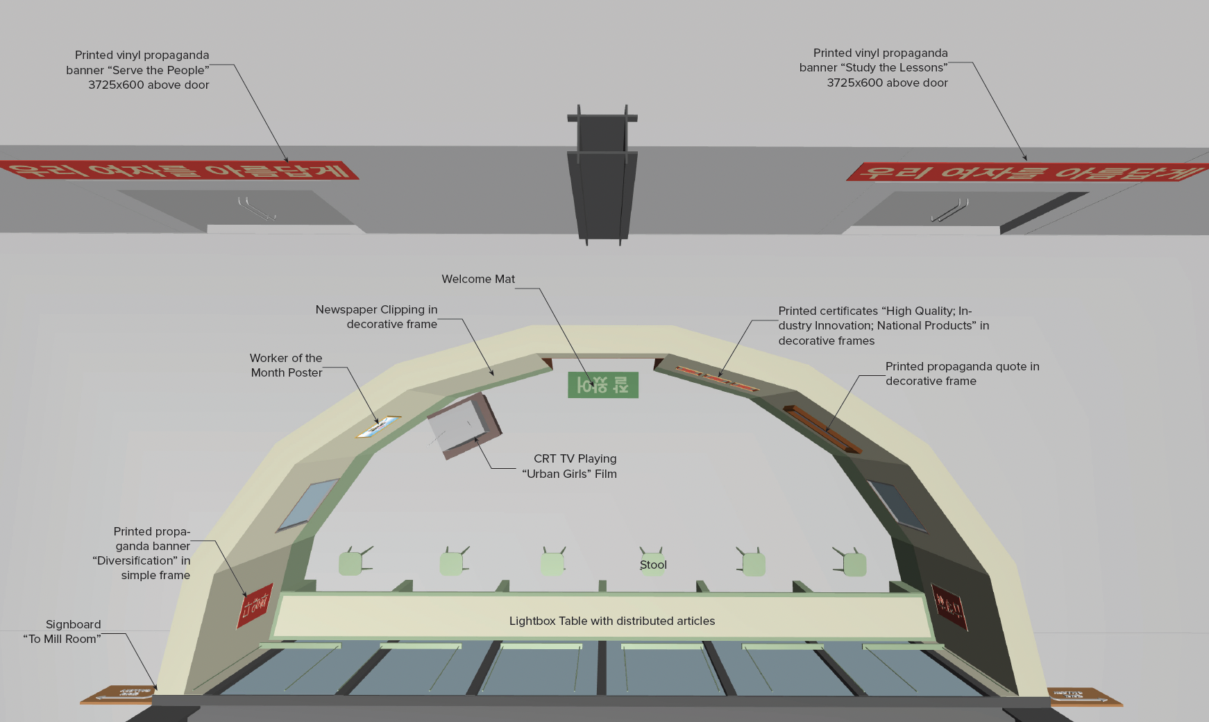 The scene setting in Myeon-bang is a DPRK cultural project that weaves a compelling tale of the nation’s second-largest export industry. It is inspired by multiple visits to Kim Jong Suk Textile Mill – DPRK’s largest textile factory floor in Pyongyang.